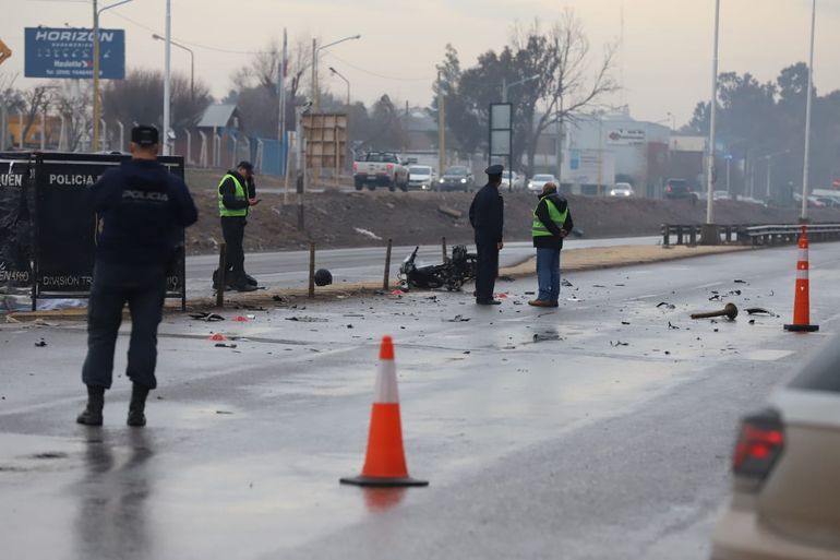 Las imágenes tras el choque fatal son impactantes: la moto quedó totalmente destrozada. El casco negro tirado a unos metros del cadáver, a la altura del ingreso al cementerio de Centenario. Otras piezas de lo que quedó de la moto blanca 110 cc desparramadas por a lo largo de la Ruta 7.