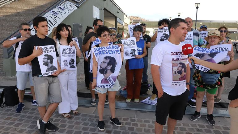 "La verdad que vivimos este día con mucha ansiedad", indicó Julio Caliani a LM Neuquén a minutos del comienzo de la primera audiencia. Acompañado de excompañeros y amigos que sostuvieron en alto carteles con la consigna "Justicia por Cali", resaltó: "lo venimos esperando hace casi 20 meses, así que es un momento muy esperado. Queremos agradecerle porque hoy hay gente de ATEN, el Movimiento de Jubilados, hay gente de la universidad que siempre ha acompañado a Juan, de ADUNC".