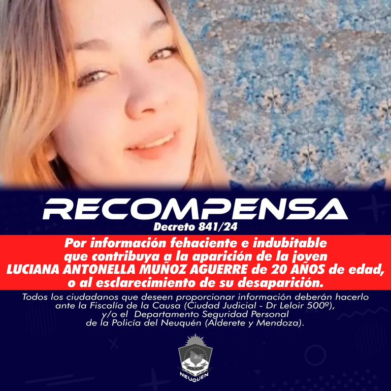 Vale recoradar que el gobierno provincial elevó de 1 a 10 millones de pesos la recompensa por información sobre el paradero de Luciana Muñoz, la joven neuquina que residía en el barrio Gran Neuquén con su abuela.