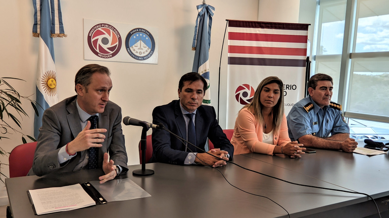 La conferencia fue encabezada por el fiscal general José Gerez, y además del fiscal García, participaron el jefe de la Policía de Neuquén Julio Peralta y la secretaria de Seguridad de la Provincia Marianina Domínguez.