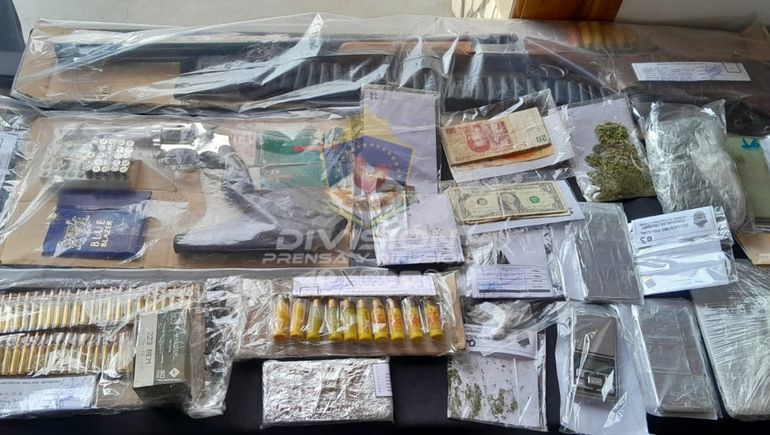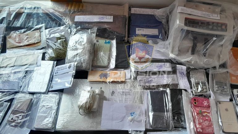 Varias de las divisiones de Departamento Antinarcóticos trabajaron en conjunto en la investigación y allanamientos que se realizaron el sábado pasado y que permitieron el secuestro de unos 4 millones de pesos, 10 kilos de marihuana, 1100 dosis de cocaína, vehículos, armas de grueso calibre, entre otros elementos.