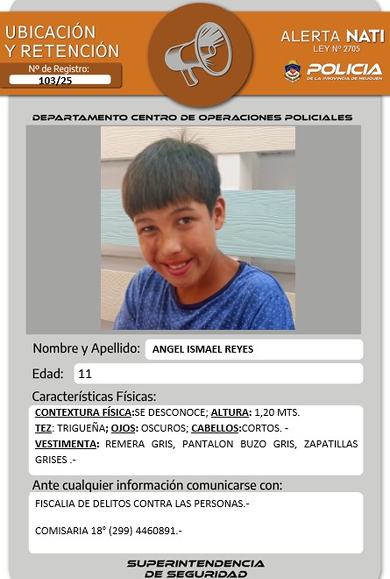Se trata de Ángel Ismael Reyes. El niño mide 1,20 metros, es de tez trigueña, ojos oscuros y cabello corto. Al momento de ausentarse, vestía una remera gris, un pantalón de buzo también gris y zapatillas grises.