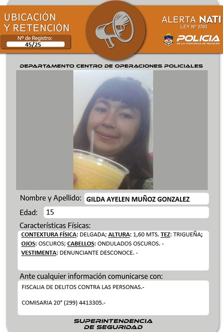 Se trata de Gilda Ayelén Muñoz González. La adolescente mide 1.60 metros, es de contextura física delgada y tez trigueña. Sus ojos son oscuros y el cabello castaño oscuro ondulado.