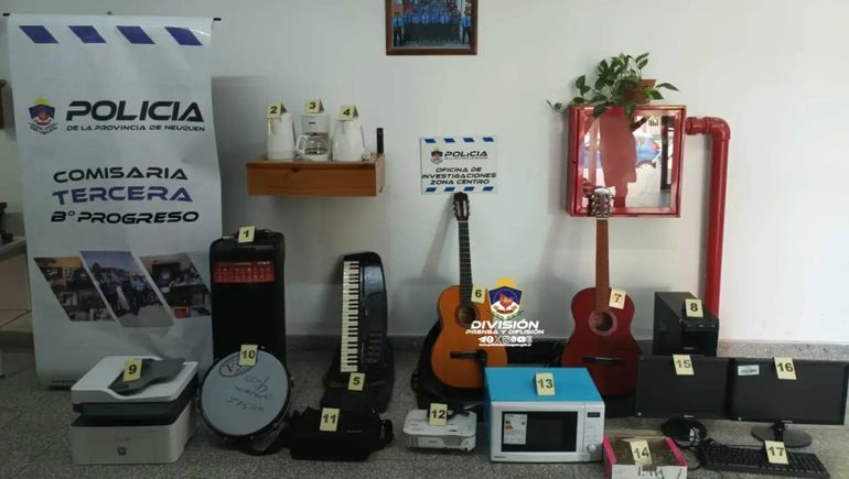 Horas más tarde, con la autorización judicial correspondiente, el personal de Comisaría Tercera terminó allanando tres domicilios sospechosos, en los cuales se logró el secuestro de: una impresora multifunción marca HP LaserJet, un teclado, un parlante torre con bluetooth marca Aiwa, un monitor led marca Samsung, un monitor led marca Philips, un CPU marca LG, un redoblante, dos pavas eléctrica, un microondas, una guitarra color marrón marca TEXAS con funda de cuero, una guitarra criolla color cedro marca Sureña, dos micrófonos, una cafetera y un proyector, entre otros elementos. Todos estos coincidían con el voluminoso botín de robo denunciado por las autoridades de la escuela primaria, por lo que fueron secuestradas y luego restituidas por orden de la fiscalía interviniente.