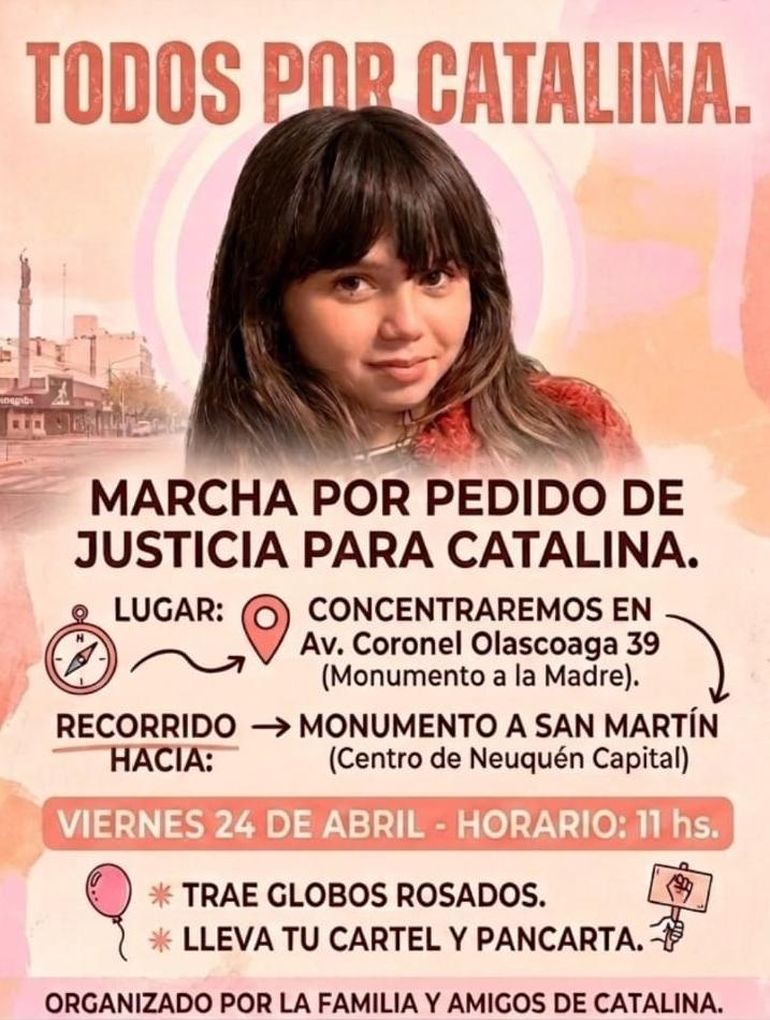 “Yo estoy al lado de mi hija, pero necesito que estén todos ahí”, pidió Paola. La convocatoria invita a asistir con globos rosados, carteles y pancartas para acompañar el pedido de justicia y generar conciencia para que lo ocurrido con Catalina no vuelva a repetirse.