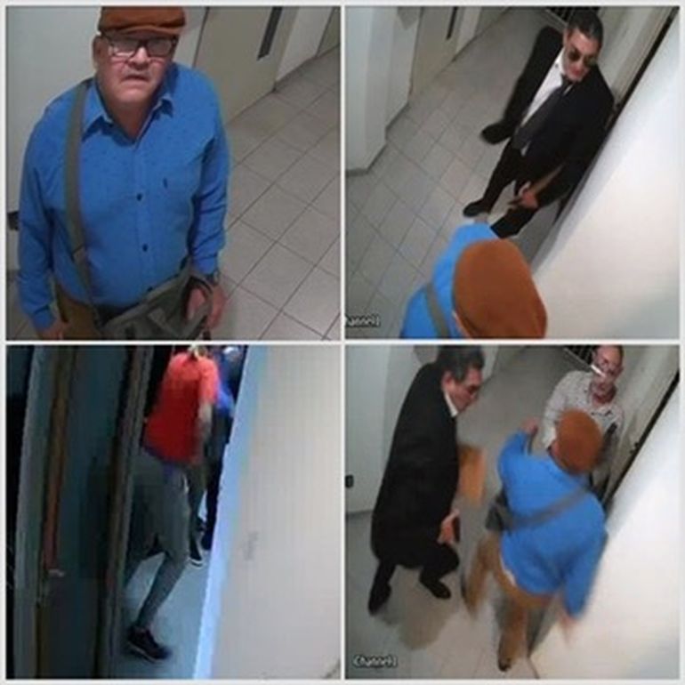 A las 12:28 se produce el ingreso al edificio de diagonal 9 de julio. Castro, con boina y bastón, va al frente. Lo sigue Falconi con un parche en el ojo y en la mochila un inhibidor de señales.