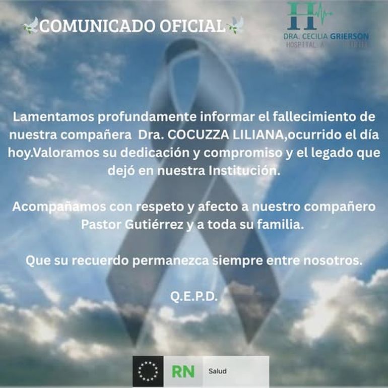 El Hospital de Catriel Cecilia Grierson publicó un comunicado para expresar la dolorosa pérdida de Liliana Cocuzzo.
