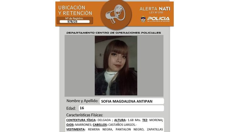 Sobre la otra adolescente, de 16 años, se trata de Sofía Magdalena Antipan cuya contextura física es delgada con una altura de 1,68 metros, de tez morena, de ojos marrones y cabellos castaños largos. Siempre de acuerdo a la denuncia radicada por familiares, la joven vestía remera y panatalón de color negro, y zapatillas blancas.