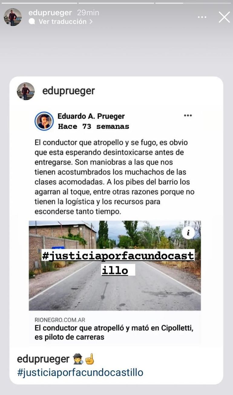 "El Prueger que intervino en la causa por la muerte de Facundo Castillo como perito, no soy yo, es Enrique mi padre. #Justiciaporfacundocastillo", escribió en una historia de Instagram. Posteriormente, también compartió una publicación que había realizado en 2021, cuando sucedió todo y el acusado, Ramiro Gutiérrez, aún seguía prófugo de la Justicia.