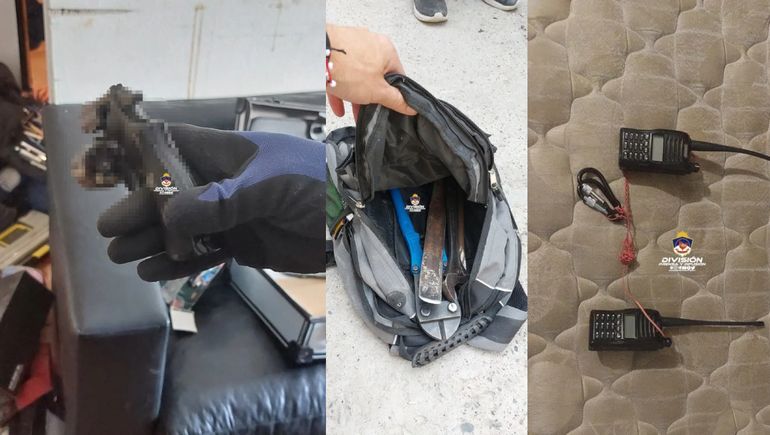 Según informó, los elementos recuperados fueron 15 municiones calibre 22, nueve celulares, una ganzúa para abrir cerraduras de vehículo, tres inhibidores de alarma, 41 mochilas y valijas vacías, un bolso negro con marca Topola con elementos para realizar pulseras, cuatro bolsos con elementos de medicina, elementos para apertura de puertas (palancas, barretas tijeras de corte), un arma de fuego tipo revólver calibre 22 marca Bagual color gris, un arma a gas comprimido con forma de pistola y 18 billeteras.