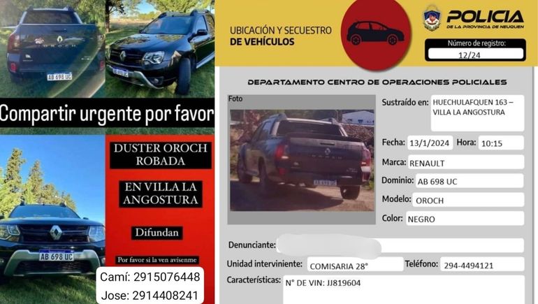 Los hombres fueron entonces identificados y conducidos nuevamente al hotel, donde se pidió ver su vehículo, una Renault Oroch color negra cuya patente original seguía colocada, por lo que fue fácil identificar que se trataba de la robada. Los sospechosos no pudieron aportar la documentación para acreditar propiedad de la misma y por ello, se dio aviso inmediato a la fiscalía de Villa La Angostura y Comisaría 28.