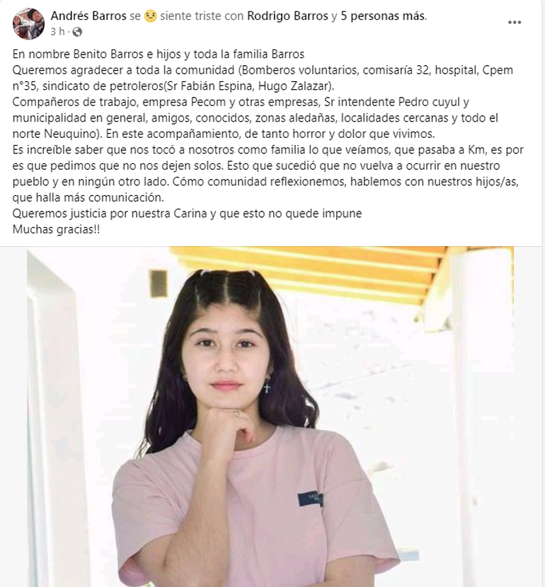 En una carta a la sociedad, dada a conocer por las redes sociales, la familia de Carina Barros agradeció a toda la comunidad, pidió que no los dejen solos y exigió justicia por el femicidio de la adolescente en la ciudad de Buta Ranquil. Por el brutal crimen, su exnovio Maicol Tapia fue acusado y quedó en preventiva.