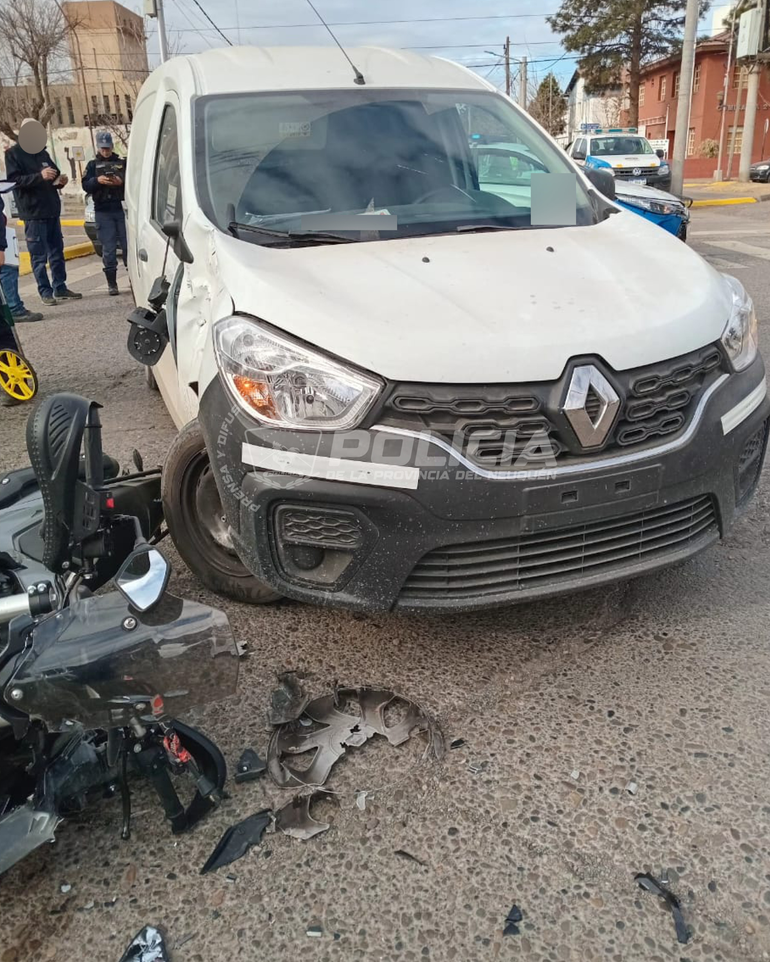 Un violento accidente de tránsito se registró en el centro de la ciudad de Neuquén. Una moto de 300 cilindrada y una camioneta Renault Kangoo colisionaron en la intersección de Avenida Olascoaga y calle Chile, lo que provocó importantes daños materiales y dejó al motociclista herido.