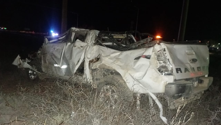 La camioneta Ford Ranger quedó totalmente destrozada luego del violento vuelco. El rodado terminó fuera de la calzada, entre los matorrales con espinas, con la carrocería retorcida y el techo hundido casi por completo. Las puertas laterales resultaron abolladas, mientras que la parte trasera presentaba severas deformaciones y daños. El impacto también afectó los ejes y las ruedas.