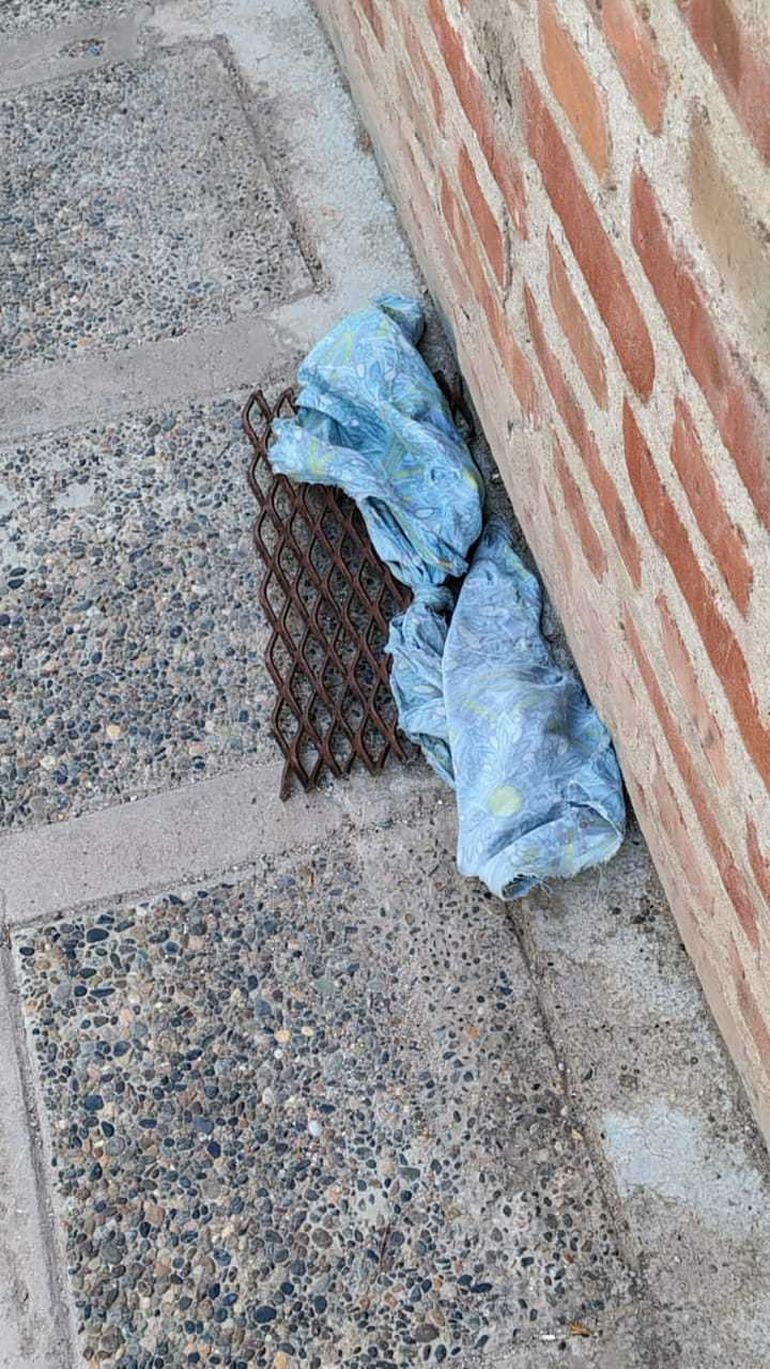 En tanto, también se destaca el recorte de malla que quedó prolijamente apoyado contra el paredón, cubierto por unos retazos de tela celeste.