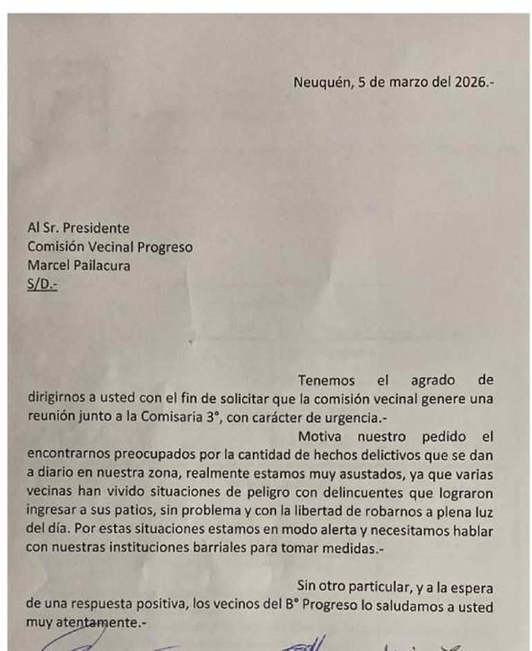 Como ocurre con otros puntos de la capital neuquina, los vecinos del barrio Progreso decidieron movilizarse por los hechos de inseguridad y pedir una reunión urgente con las autoridades policiales de la jurisdicción. Las familias no ocultan su temor por la impunidad que muestran los delincuentes, ingresando a las propiedades a plena luz del día.