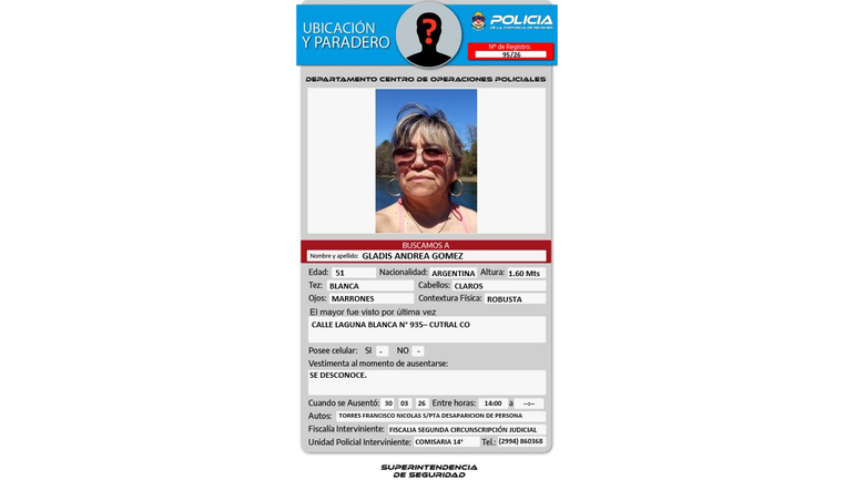 La Comisaría 14° de Cutral Co inició la búsqueda de Gladis Andrea Gómez, quien fue vista por última vez el 30 de marzo alrededor de las 14 horas, en una vivienda ubicada en calle Laguna Blanca N° 935.