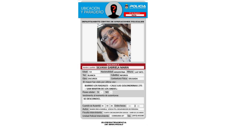 El segundo operativo está a cargo de la Comisaría 43°, de la zona cordillerana, para dar con el paradero de Silvana Gabriela Marín, quien fue vista por última vez el 16 de marzo de 2024 en el barrio Los Radales, sobre calle Las Golondrinas 275, en San Martín de los Andes.