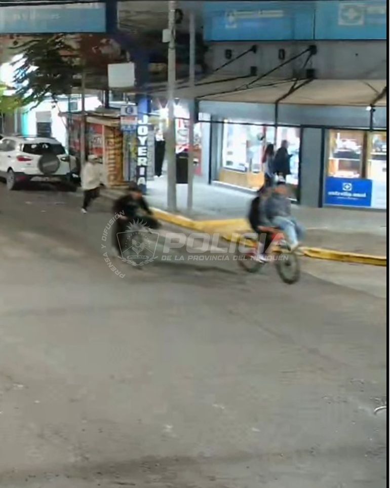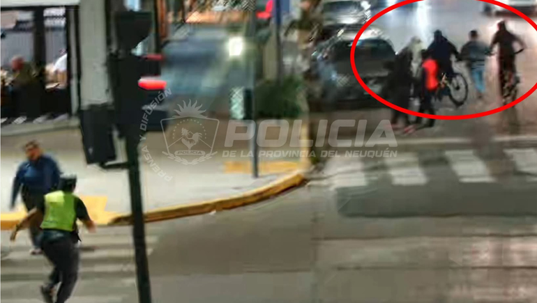 Al advertir la presencia policial, los jóvenes escaparon por calle Alcorta hacia el oeste. En las imágenes publicadas por la Policía de Neuquén puede observarse a dos jóvenes en una bicicleta, uno de ellos sobre el manubrio, y a otro que avanzan por el medio de la calle.