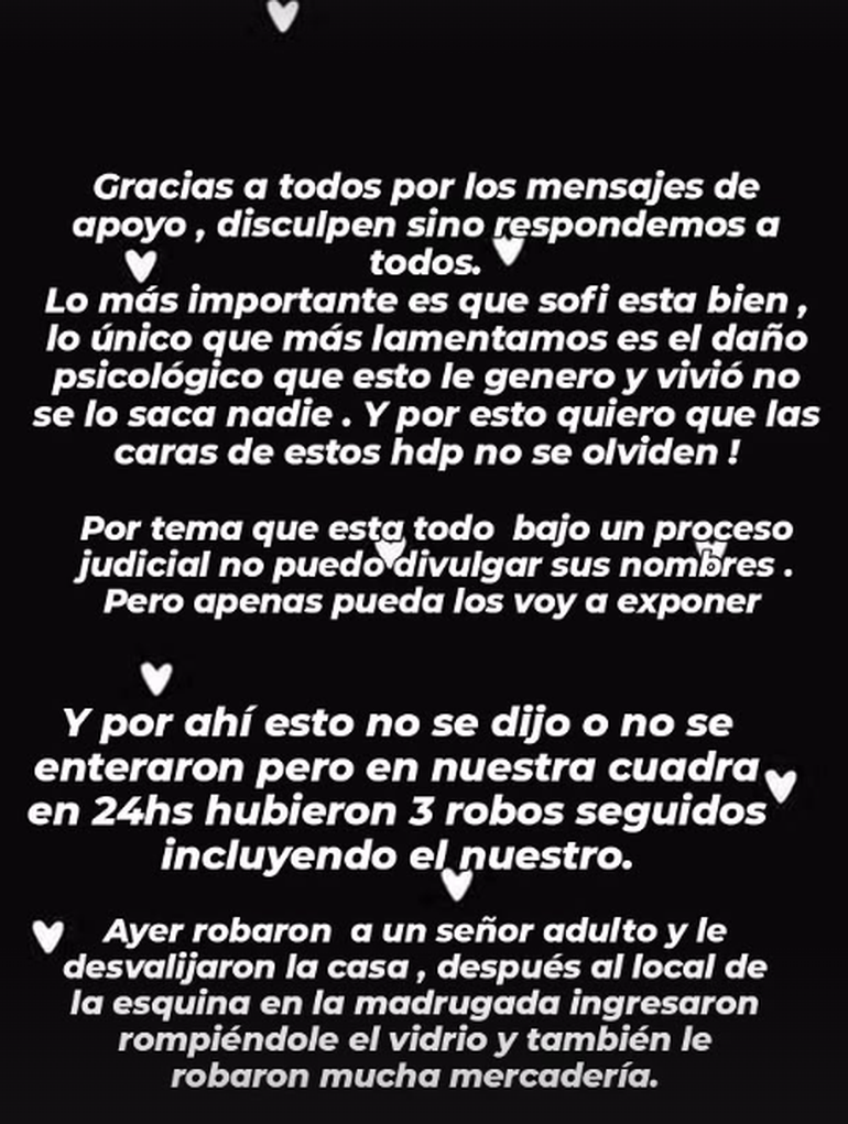 Tras hacerse público el video, muchos comentarios en las redes sociales afirmaban que se trataba de unos "trapitos" que son conocidos en la zona. Y también se conoció que hubo tres robos en el mismo sector en menos de 24 horas: "En esa misma cuadra hubo tres robos. Primero, a unos abuelos que viene en esa cuadra, le desvalijaron todo; después a la madrugada robaron a un local de la esquina; y luego a mi local en pleno centro, donde está todo abierto", contó Jazmín, dueña del comercio.