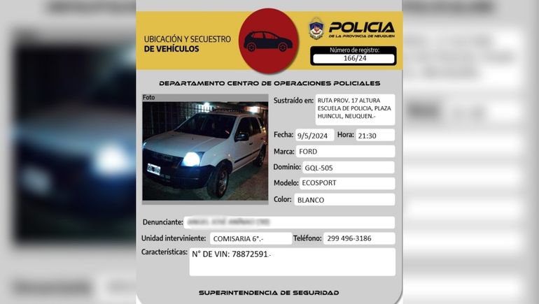 "En el procedimiento intervino personal de la Comisaría 13 de San Patricio del Chañar que dio en calle Complejo Chocón y Nahuel Huapi con un joven de 26 años quien conducía el Peugeot 207 negro que tendría una estrecha vinculación con el hecho investigado", resaltó el director de Seguridad.