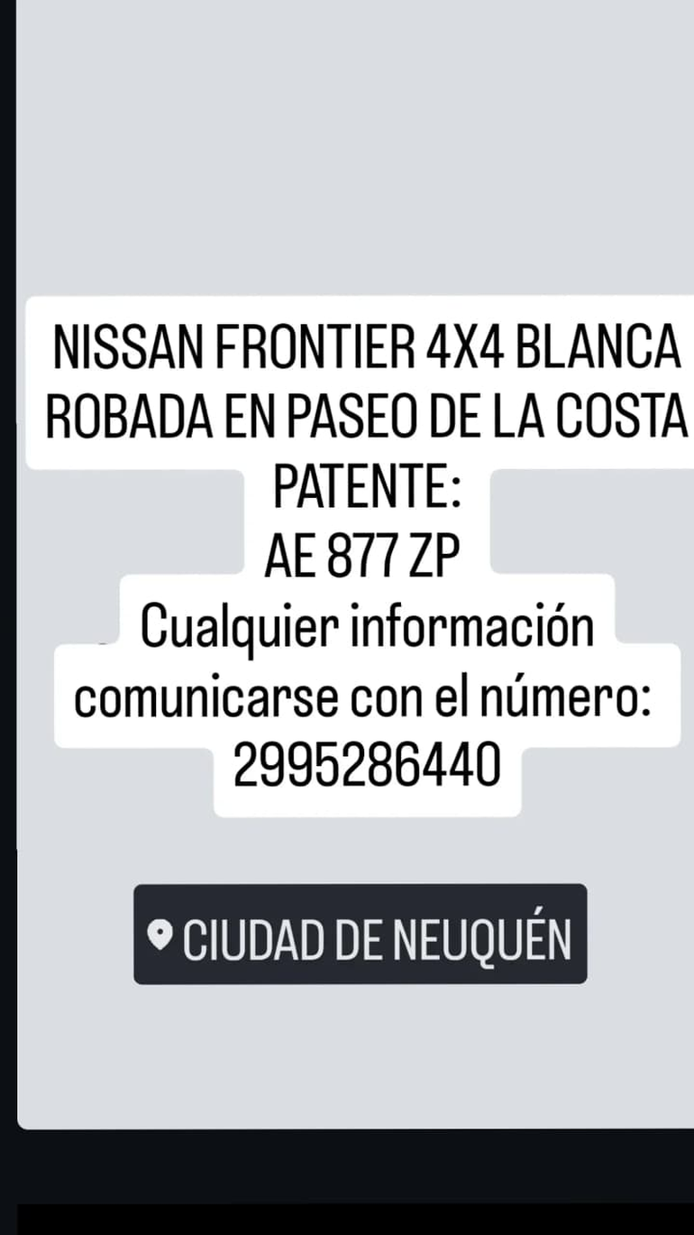 Ante cualquier información relacionada con el paradero de la camioneta Nissan Frontier 4x4 blanca, patente AE 877 ZP, sin jaula antivuelco, solicitaron comunicarse al 2995286440.