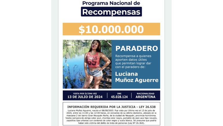 A más de un año de la desaparición de Luciana Muñoz, el Ministerio de Seguridad de la Nación oficializó la nacionalización de su búsqueda y dispuso una recompensa de 10 millones de pesos para quienes aporten información útil que permita dar con su paradero. Entre los fundamentos se contempla la hipótesis de que el hecho puede vincularse a la trata de personas.