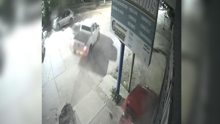 En la secuencia que pudieron registrar con las cámaras de seguridad se observa que una camioneta irrumpe a alta velocidad y se estrella contra el Gol rojo, luego se ve afectado el auto blanco, que estaba adelante, y el vehículo de mayor porte se da raudamente a la fuga.