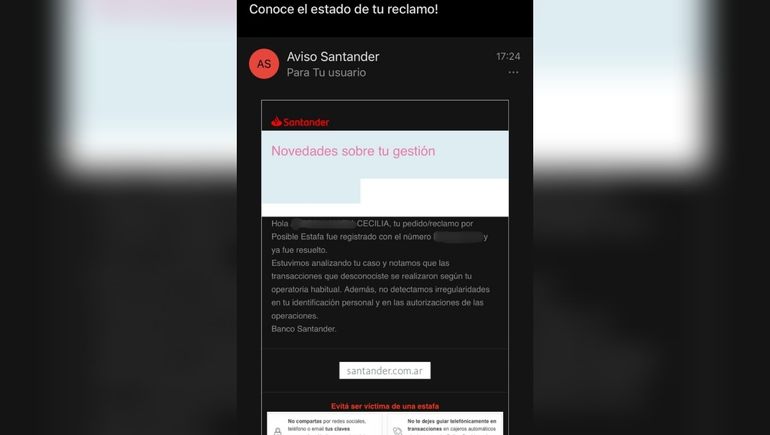 "Estuvimos analizando tu caso y notamos que las transacciones que desconociste se realizaron según tu operatoria habitual", se observa que comunicaron en un mail que recibió Cecilia.