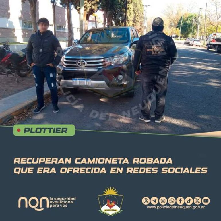 De manera casual, la víctima del robo tomó conocimiento del ofrecimiento de su vehículo y se comunicó rápidamente con la Policía rionegrina para confirmar qué se podía hacer para recuperarla. La denuncia inicial había sido radicada en la Comisaría Cuarta de la ciudad de Cipolletti.