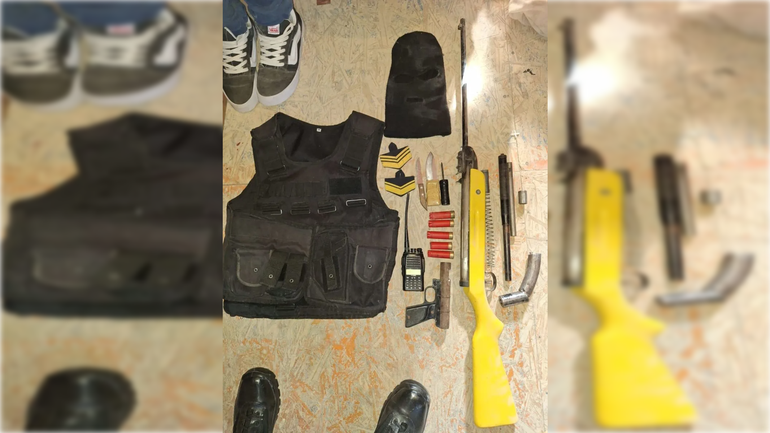 En el segundo domicilio, los efectivos hallaron una funda porta placa con un equipo de comunicación en su interior, jerarquías policiales, cartuchos de escopeta percutados, un arma de fabricación casera tipo “tumbera”, una réplica de rifle de aire comprimido, un pasamontaña, elementos corto punzantes de confección casera y una motocicleta con pedido de secuestro por robo en Neuquén.