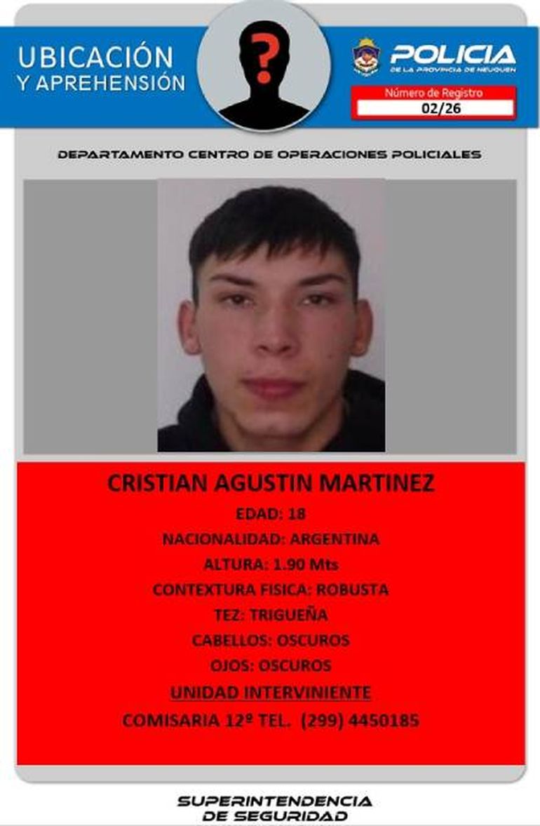El prófugo, identificado como Cristián Agustín Martínez, de 18 años, no pasa desapercibido porque mide 1,90 metros y tiene una contextura física robusta. En cuanto al color de ojos, son oscuros y los cabellos, también son del mismo color. Su búsqueda fue lanzada por la Comisaría 12 debido a que debía permanecer en un domicilio de esa jurisdicción aunque en este momento el alerta se ha extendido al conjunto de las unidades de la provincia.