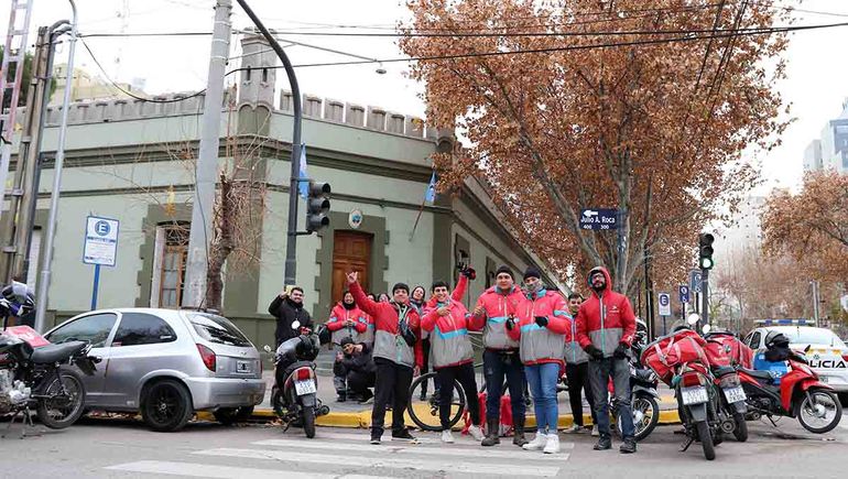 Repartidores de Pedidos Ya se reunieron a las afueras de Casa de Gobierno de Neuquén, este martes al mediodía, para reclamar por mayor seguridad. Denuncian que los robos en la ciudad son constantes y que pierden una moto por día en manos de la delincuencia.