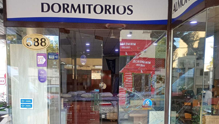 El comercio llamado Dormilindo ubicado en las calles Perito Moreno y Bahía Blanca, quedó con el frente gravemente dañado porque los delincuentes reventaron la puerta de vidrios blindex.
