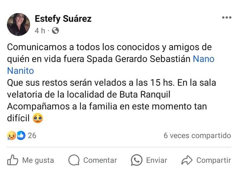En tanto, LMN pudo conocer que la víctima fatal es Sebastian Spada, vecino de Buta Ranquil, al igual que su padre. Trabajaba como empleado de seguridad y era padre de una niña.