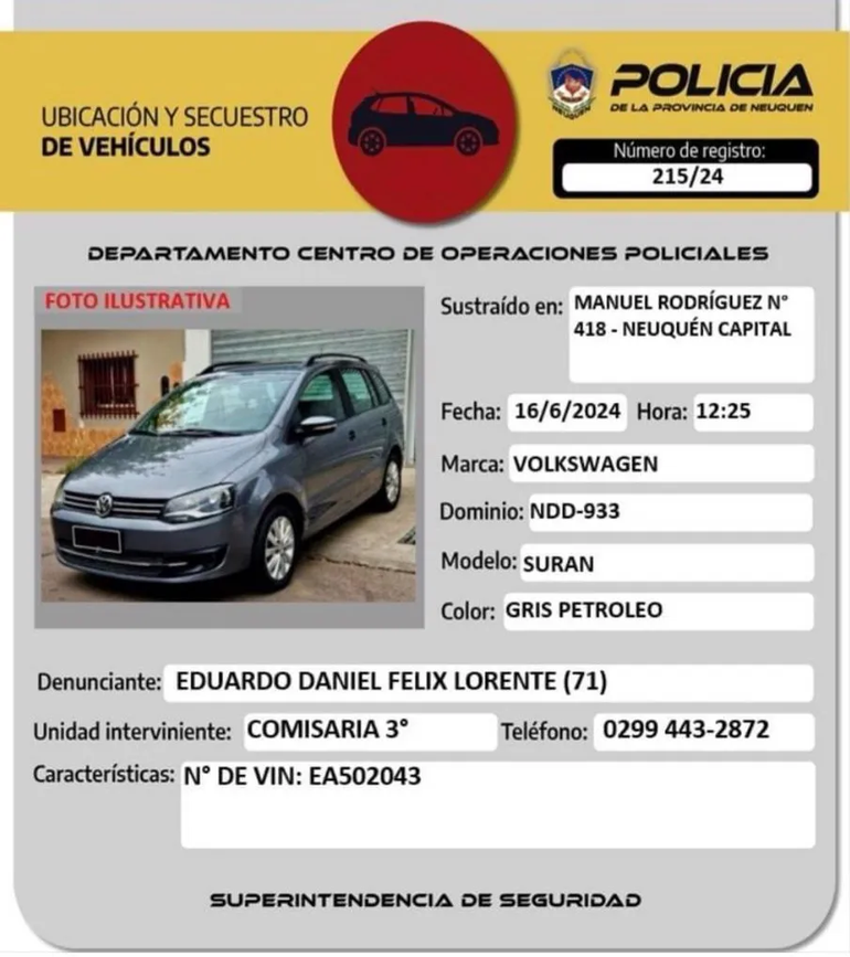 El robo tuvo lugar sobre calles Manuel Rodríguez y Belgrano al 250, frente a una plaza del sector, alrededor de las 7:45. El auto se trata de un Volkswagen Suran color gris oscuro, patente NDD 933, que es usado por la Parroquia para llevar adelante sus tareas y visitar distintas comunidades.
