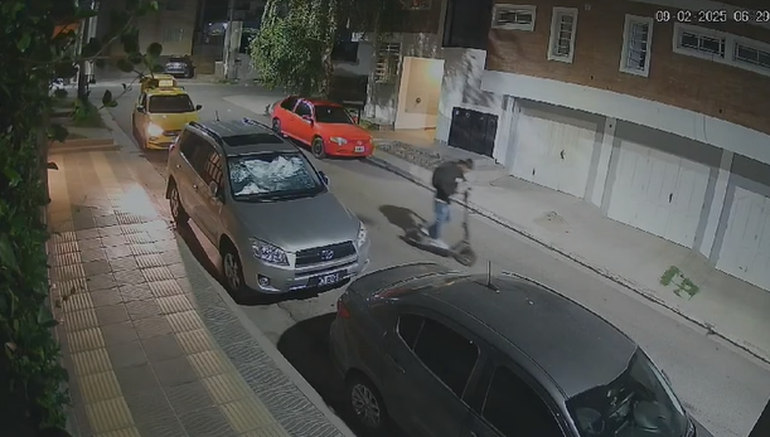 Si bien vio al taxi, no advirtió en ese momento de la presencia de los ladrones. Lo constató más tarde cuando no encontró su monopatín, pidió las cámaras de seguridad a sus vecinos y comprobaron así cómo había sido la maniobra delictiva.