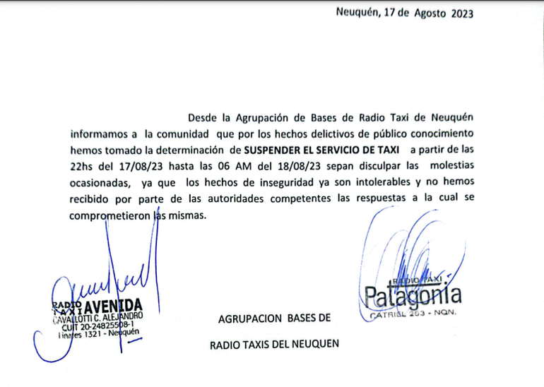"Informamos a la comunidad que por los hechos delictivos de público conocimiento hemos tomado la determinación de suspender el servicio de taxi a partir de las 22 hs del 17/8/23 a las 6 del 18/8/23. Sepan disculpar las molestias ocasionadas, ya que los hechos de inseguridad ya son intolerables y no hemos recibido por parte de las autoridades competentes las respuestas a la cual se comprometieron las mismas".