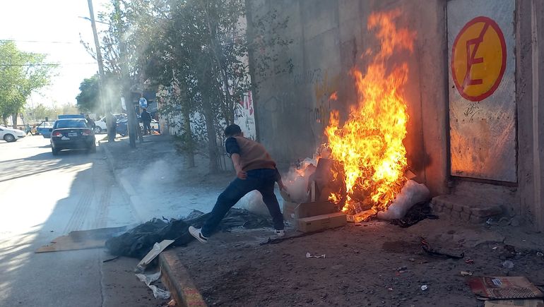 En cuanto a los daños, se observó un golpe con un objeto contundente en el vidrio de la camioneta, y la moto tirada en el suelo y pateada. Además, LMNeuquén registró el momento en que un grupo de personas prendió fuego una entrada lateral al comercio utilizando elementos.
