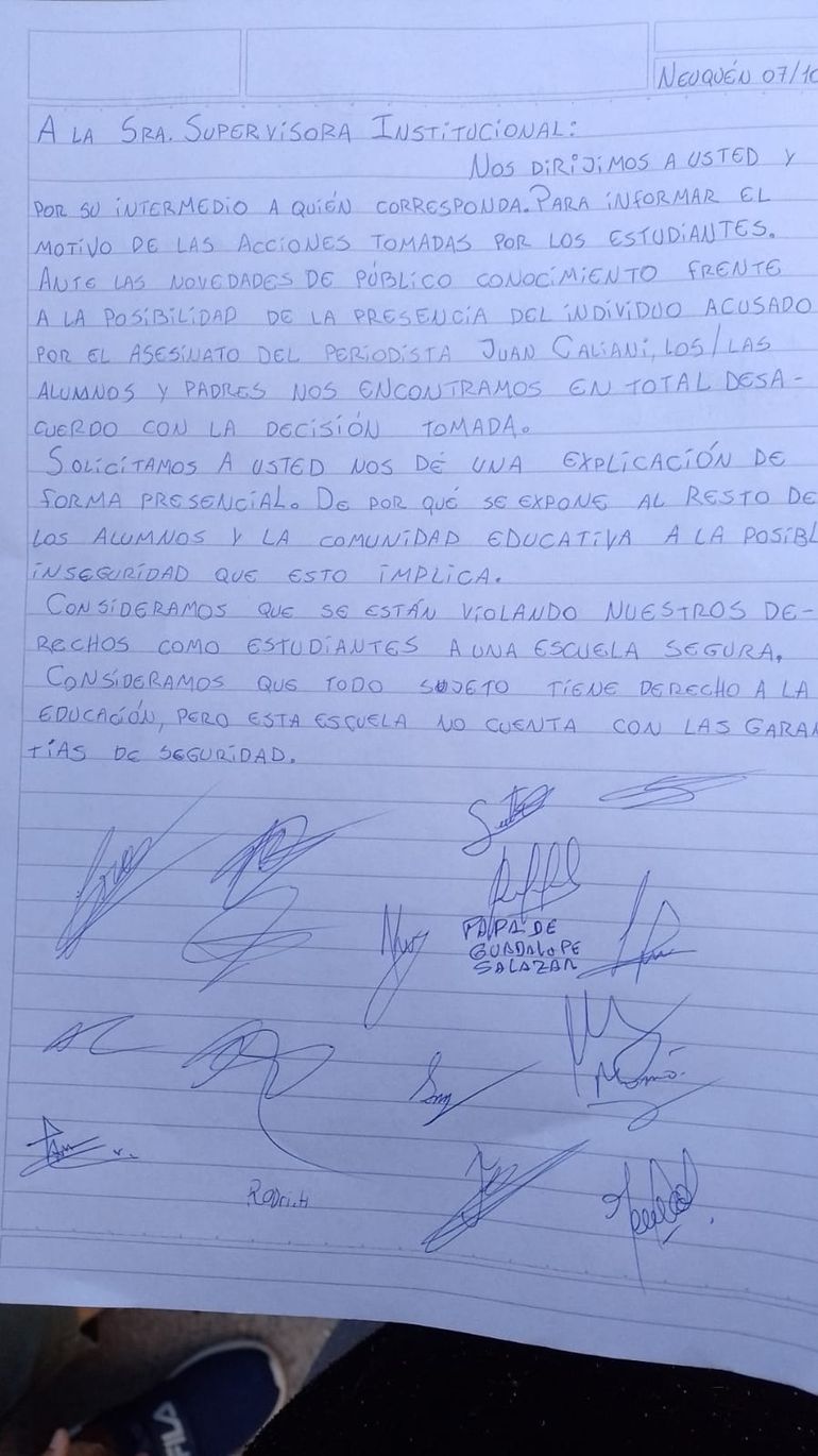 La preocupación de las y los estudiantes está relacionada también a las condiciones en las que el joven condenado por el asesinato del periodista neuquino ingresaría a cursar. "Él es estudiante de la institución y su familia acordó que iba a comenzar a tener educación virtual, pero de repente nos enteramos de que no", advierte Valentina. En este sentido, también reclaman información oficial porque todo lo que saben por los medios de comunicación.
