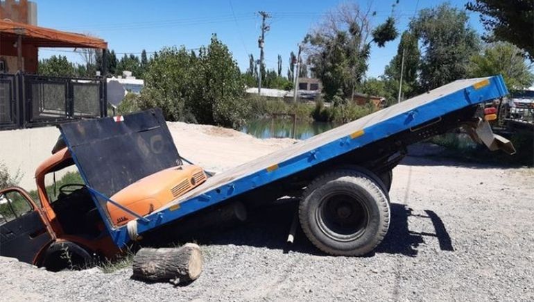 Según relató el portal TodoRoca.com, y por motivos que se desconocen, el conductor de un viejo camión Mercedes Benz terminó con la trompa del vehículo dentro del canal de riego.