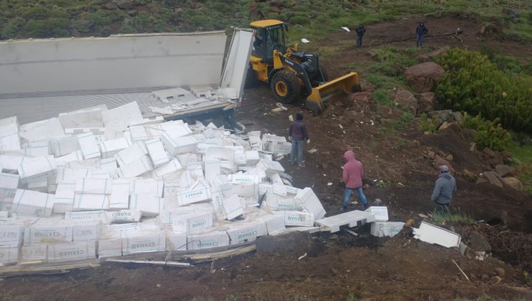 El camión llevaba una enorme carga de salmón. Cientos de cajas de salmón cayeron y quedaron a la intemperie, perdiendo así la cadena de frío. En el lugar intervino el Senasa y gente de la aduana, mientras que fue convocado personal de la Comisaría 27 de Las Lajas, para que custodiara la carga y el camión.