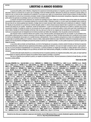 En medio de la definición de la Justicia, que le negó la domiciliaria al ex vicepresidente Amado Boudou, dirigentes del oficialismo, líderes políticos de Latinoamérica, actores y periodistas reconocidos firmaron una solicitada para reclamar la libertad del ex funcionario.