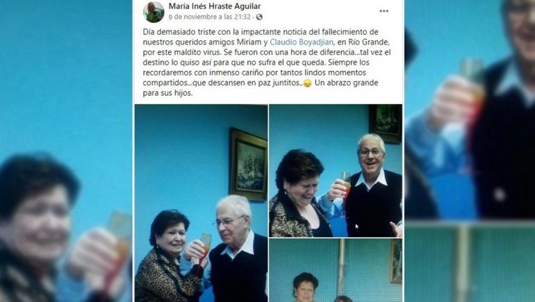 "Día demasiado triste con la impactante noticia del fallecimiento de nuestros queridos amigos Miriam y Claudio Boyadjian, en Río Grande, por este maldito virus. Se fueron con una hora de diferencia", arrancó el escrito María Inés Hraste Aguilar sobre el matrimonio de más de 53 años, y continuó: "Tal vez el destino lo quiso así para que no sufra el que queda. Siempre los recordaremos con inmenso cariño por tantos lindos momentos compartidos... Qué descansen en paz juntitos. Un abrazo grande para sus hijos".