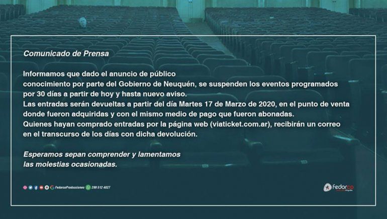 Todos los eventos previstos para realizarse en los próximos meses en el estadio Ruca Che y el Espacio Duam fueron suspendidos, entre ellos el recital de NTVG, que aún no tiene fecha de reprogramación.