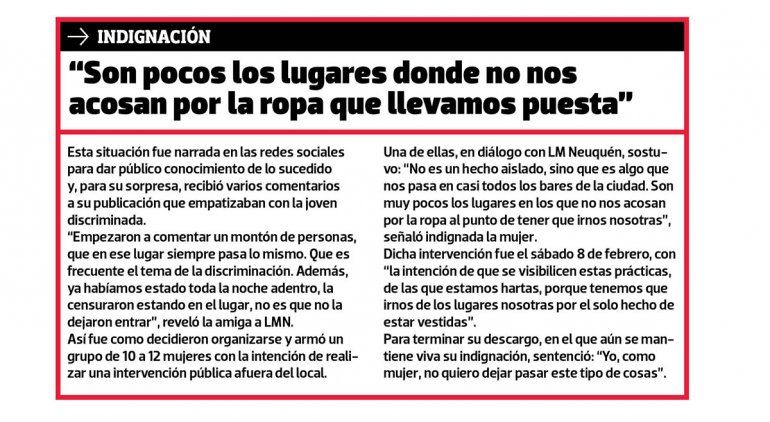 “Tapate que no podés estar en top”, fueron las palabras de la seguridad privada de un bar bailable, del centro neuquino, a una joven que se encontraba en el lugar.