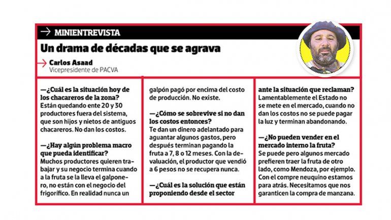 La situación se conoció por el reclamo de José Carlos Asaad, vicepresidente de Productores Agremiados de Centenario y Vista Alegre (PACVA), una entidad que nuclea a unos 103 chacareros. El productor escribió una carta en Facebook que poco a poco se empezó a viralizar y llegó a las más altas esferas del gobierno neuquino. En ella dio a conocer los lamentos del sector y pidió la intervención urgente del Estado en el mercado. ¿Cuál es la idea? Que el gobierno neuquino compre lotes de peras y manzanas para proveer a escuelas y hospitales como parte de un proyecto de alimentación saludable. Ya sucedió con una iniciativa piloto en algunos establecimientos.