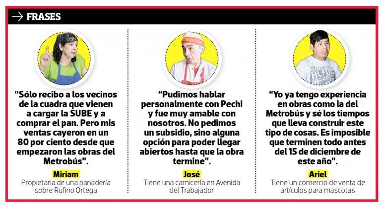 Ricardo, un tapicero de la zona, explicó que necesita que los autos se apeen en su local para tapizar las butacas, mientras que Ariel, desde un petshop, agregó que las ventas al paso representan un importante porcentaje del total de sus ventas.