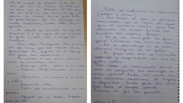 Este viernes por la mañana, docentes y directivos de la Escuela N° 190 se reunieron y también decidieron suspender el inicio de clases. Entre otras cosas, plantearon que solo cuentan con dos auxiliares de servicio por cada turno, lo que pone en riesgo que se garantice la higiene y el refrigerio.