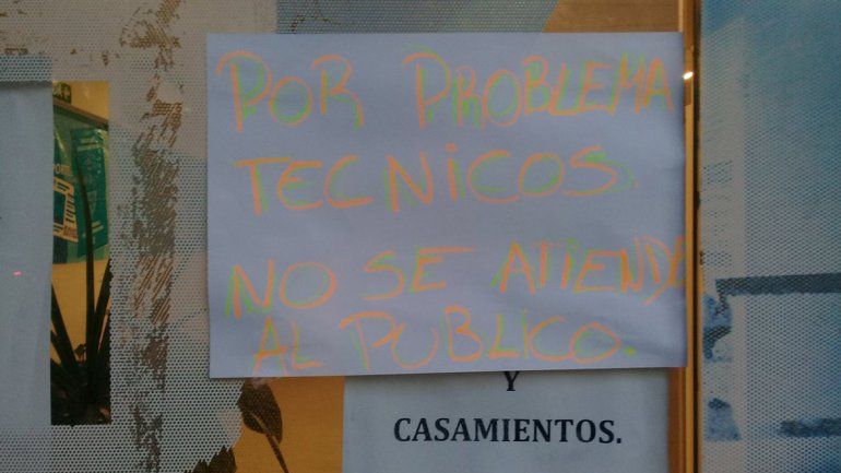 La atención en las oficinas del Registro Civil –en el Centro de Documentación Rápida se vio resentida este miércoles por un reclamo de los trabajadores. “Por problemas técnicos no se atiende al público”, reza un cartel en la calle Brown de esta Capital.